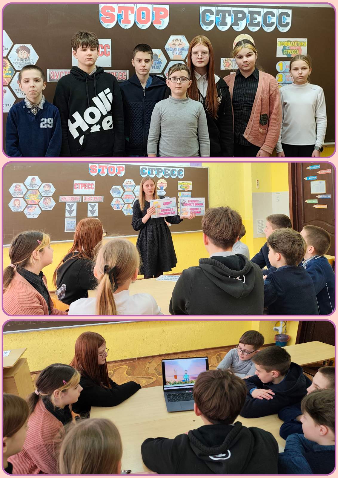 С целью формирования у учащихся умения распознавать стресс и освоить простые техники саморегуляции для учащихся 5-9 классов была проведена интерактивная лекция-викторина «Стоп Стресс!». В теоретическом блоке ребята узнали что такое «стресс» и откуда он берется. В ходе мозгового штурма были раскрыты причины стресса у подростков. Целью практического блока мероприятия стало создание «Аптечки скорой помощи при стрессе».