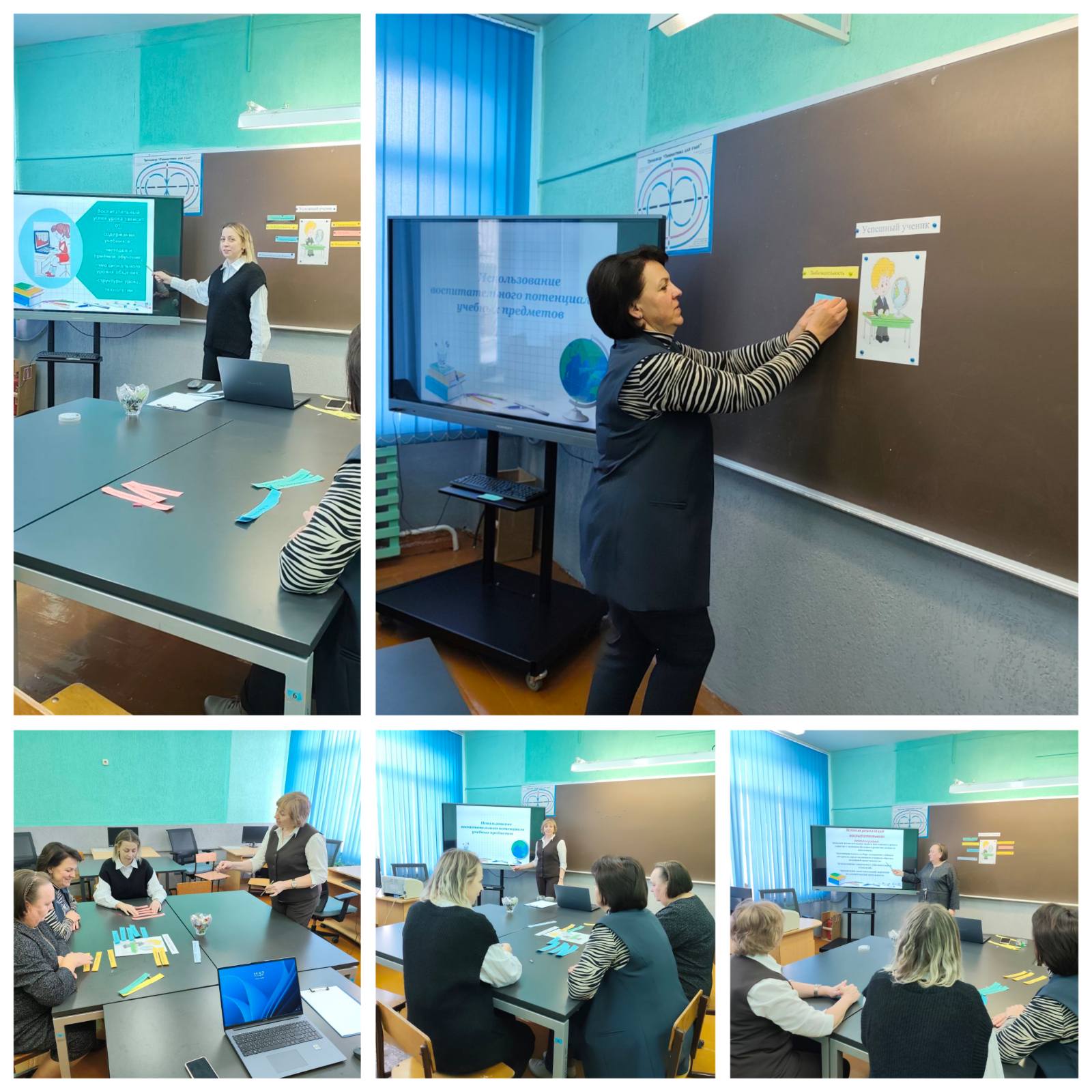 В ходе работы методического объединения педагоги не только рассказали, но и на практике показали приёмы воспитательных задач и приёмы современных педагогических технологий, которые они используют в учебном процессе. Для закрепления материала учителя создали модель современного урока с реализацией воспитательного потенциала.