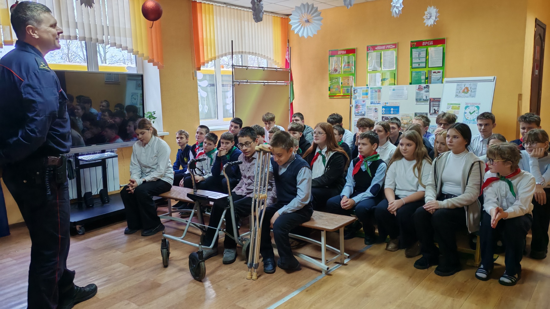 17 декабря 2025 года накануне зимних каникул и в преддверии новогодних праздников года старший инспектор ИНД Молодечненского РОВД Танюкевич А.В. провела профилактическую беседу с учащимися школы. Особое внимание уделялось профилактике преступлений, травматизма, ответственности за совершение правонарушений и уголовно-наказуемых деяний. Во время беседы учащимся напомнили о мерах безопасности в зимний период и о правилах безопасного поведения на каникулах в темное время суток. Учащимся напомнили об опасности использования пиротехнических изделий.