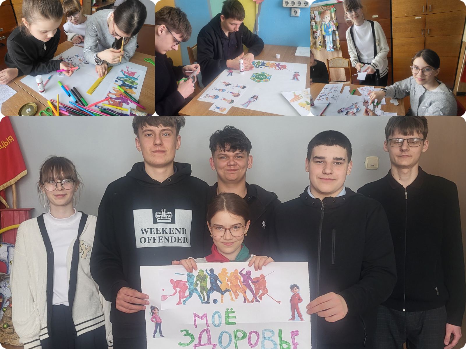 Учащиеся 5-9 классов создавали коллаж на тему "Мое здоровье". При форме такой работы школьники перестают воспринимать здоровье просто как «отсутствие болезней». Они начинают понимать, что оно состоит из компонентов: физическое, психическое (эмоциональное) и социальное здоровье. Получается яркий плакат, который отражает актуальные темы для подростков (мода на спорт, отказ от вейпов, режим дня, ментальное здоровье, дружба как часть здоровья).