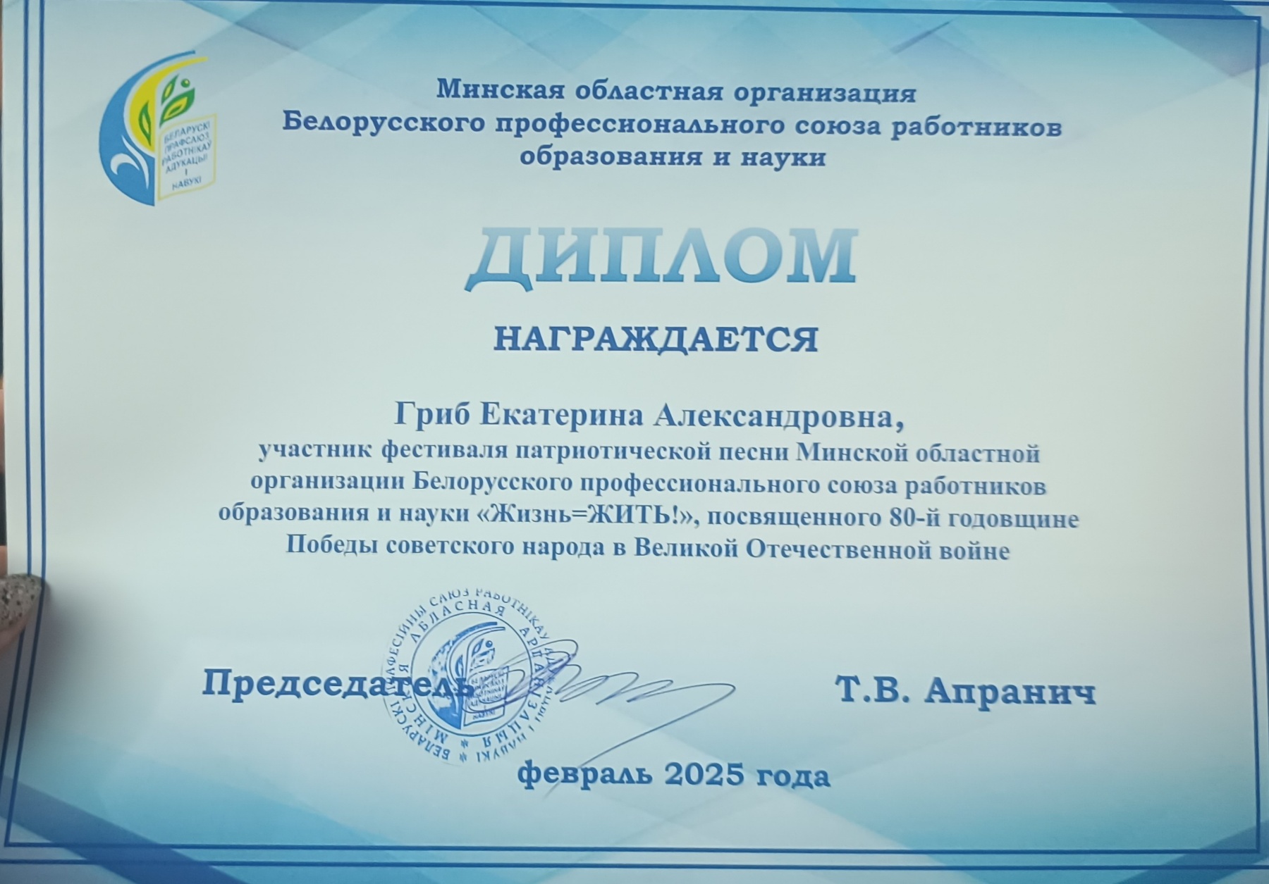 26 февраля 2025 года Екатерина Александровна Гриб, член профсоюзной организации, всё также с большим успехом приняла участие в очередном этапе фестиваля патриотической песни Минской областной организации Белорусского профессионального союза работников образования и науки "Жизнь=ЖИТЬ", посвященном 80-й годовщине Победы советского народа в Великой Отечественной войне!