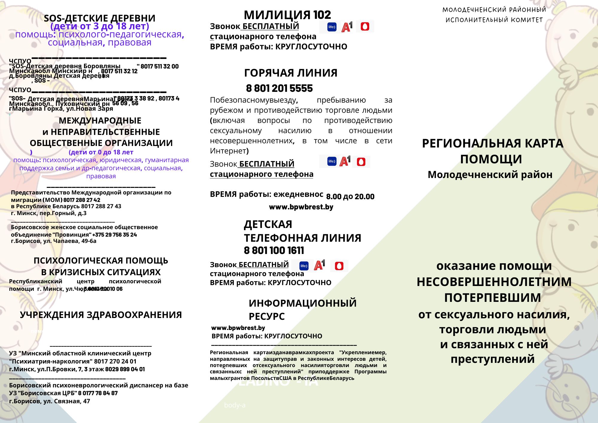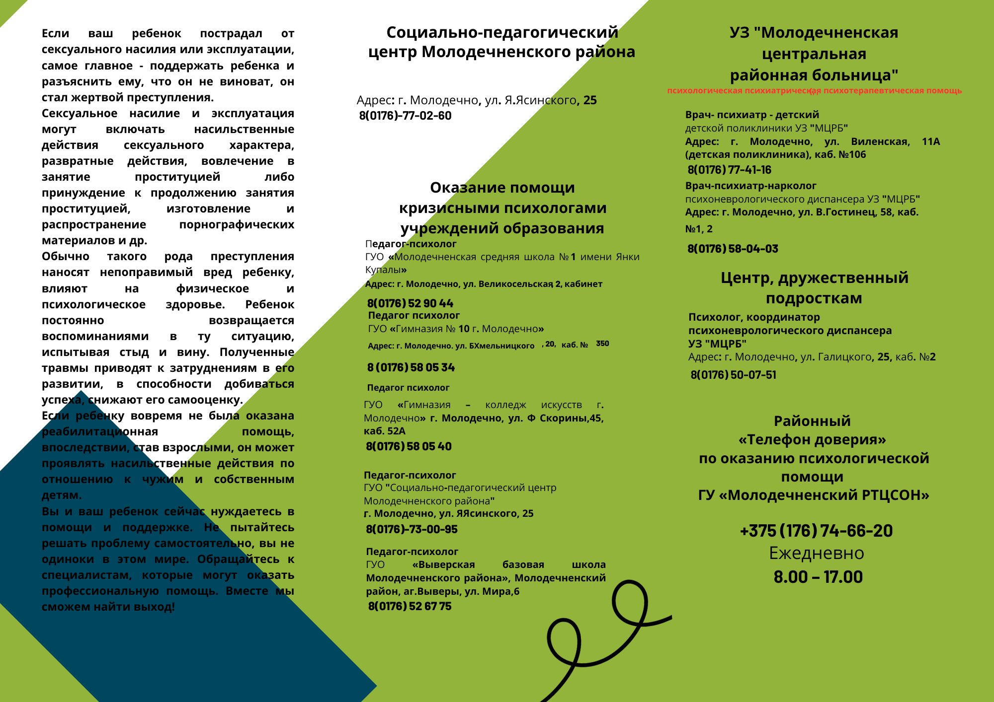 «Телефон доверия» службы экстренной психологической помощи в г. Минске 8(017) 202-04-01, круглосуточно.