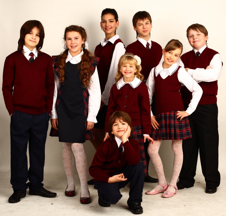 Для девочек (девушек) – пиджак, жилет, юбка, брюки, блузка с короткими и длинными рукавами, сарафан. В зимнее время в комплекты могут входить трикотажные свитер или жилет.