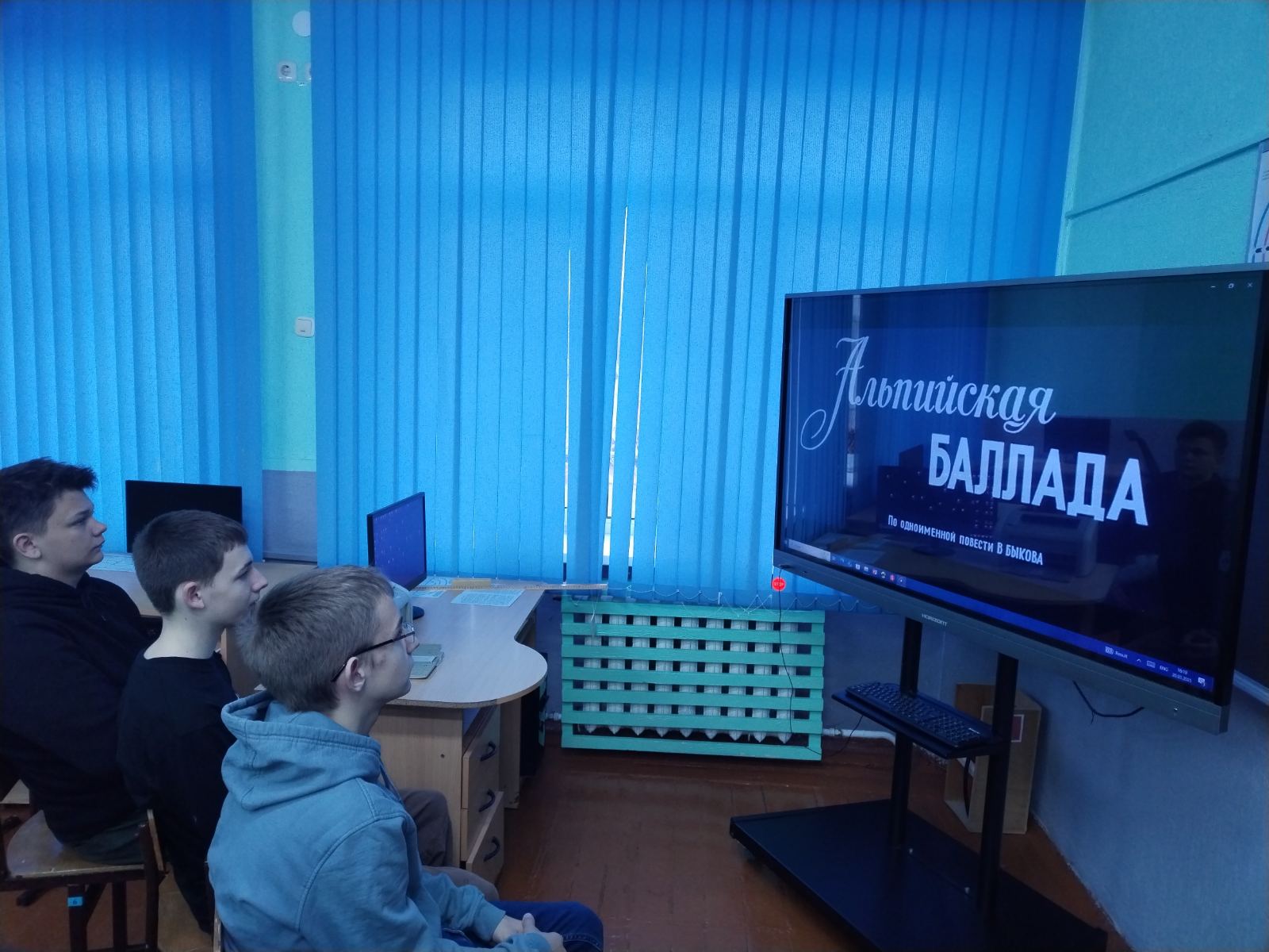 Сегодня, в первый день каникул, для восьмиклассников был организован просмотр художественного фильма "Альпийская баллада", снятого по одноименному произведению белорусского писателя Василя Быкова. В импровизированном кинозале после просмотра фильма учащиеся поделились впечатлениями, отметив, что сюжет "Альпийской баллады" необычен для фильма о войне. По мнению ребят, три дня совместной жизни бежавших из плена во время Второй мировой войны в Альпах белоруса Ивана и итальянки Джулии реалистично правдивы и вместе с тем романтичны. Киноленту однозначно стоит посмотреть!, снятого по одноименному произведению белорусского писателя Василя Быкова. В импровизированном кинозале после просмотра фильма учащиеся поделились впечатлениями, отметив, что сюжет "Альпийской баллады" необычен для фильма о войне. По мнению ребят, три дня совместной жизни бежавших из плена во время Второй мировой войны в Альпах белоруса Ивана и итальянки Джулии реалистично правдивы и вместе с тем романтичны. Киноленту однозначно стоит посмотреть!