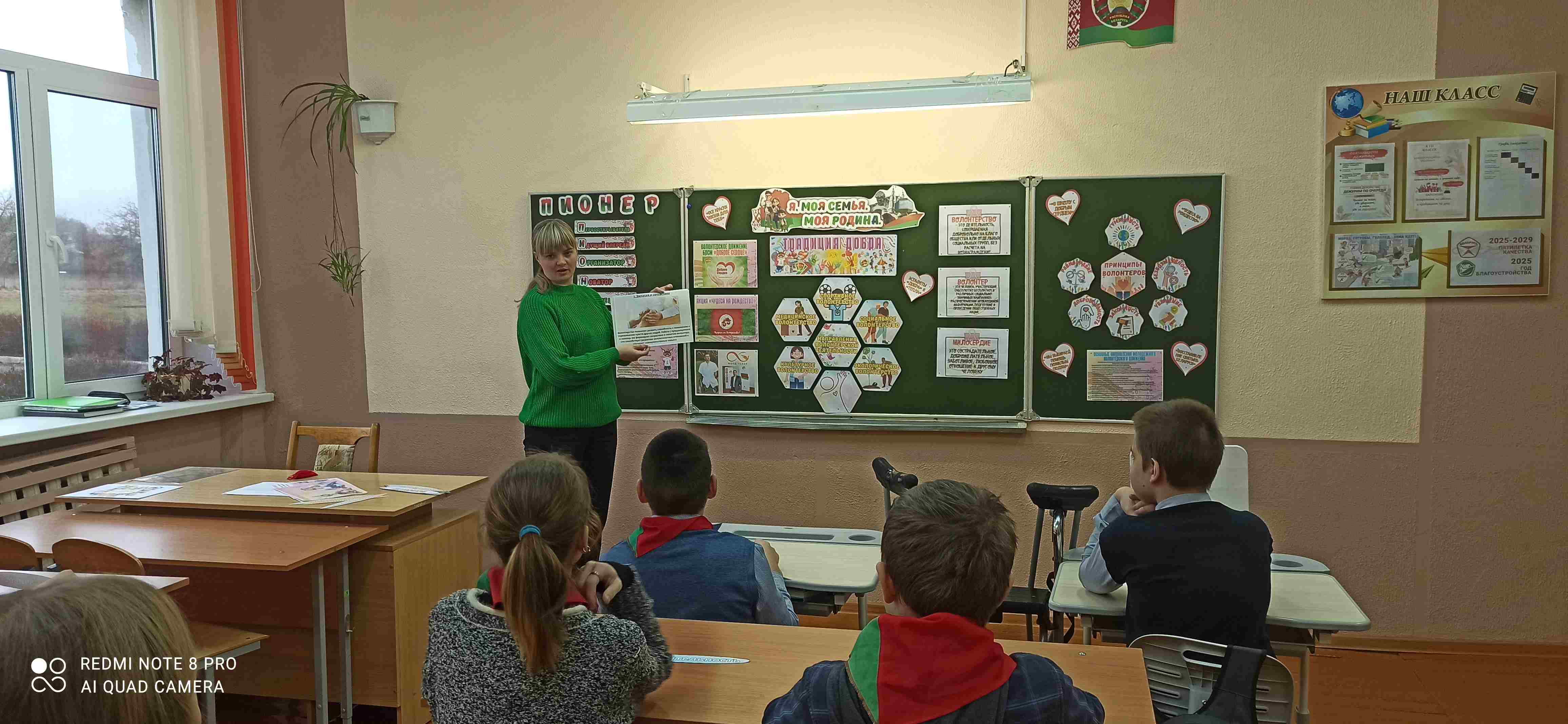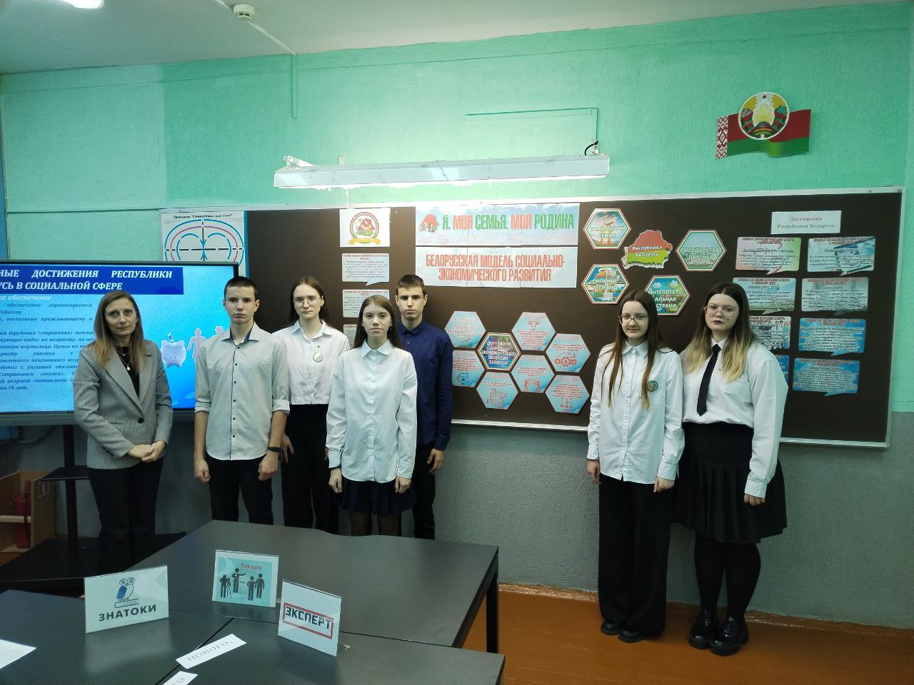 24 января 2025 года для учащихся 9 класса был проведён классный час в рамках обучающей программы "Я. Моя семья. Моя Родина" "Белорусская модель социально-экономического развития". В ходе организованного телевизионного ток-шоу учащиеся познакомились с особенностями белорусской модели социально-экономического развития, ее основными принципами. Выступая с подготовленными докладами, ребята постепенно к концу мероприятия оформили тематическую выставку достижений социально-экономического развития белорусского народа. Мероприятие способствовало развитию навыков анализа и критического мышления подростков.