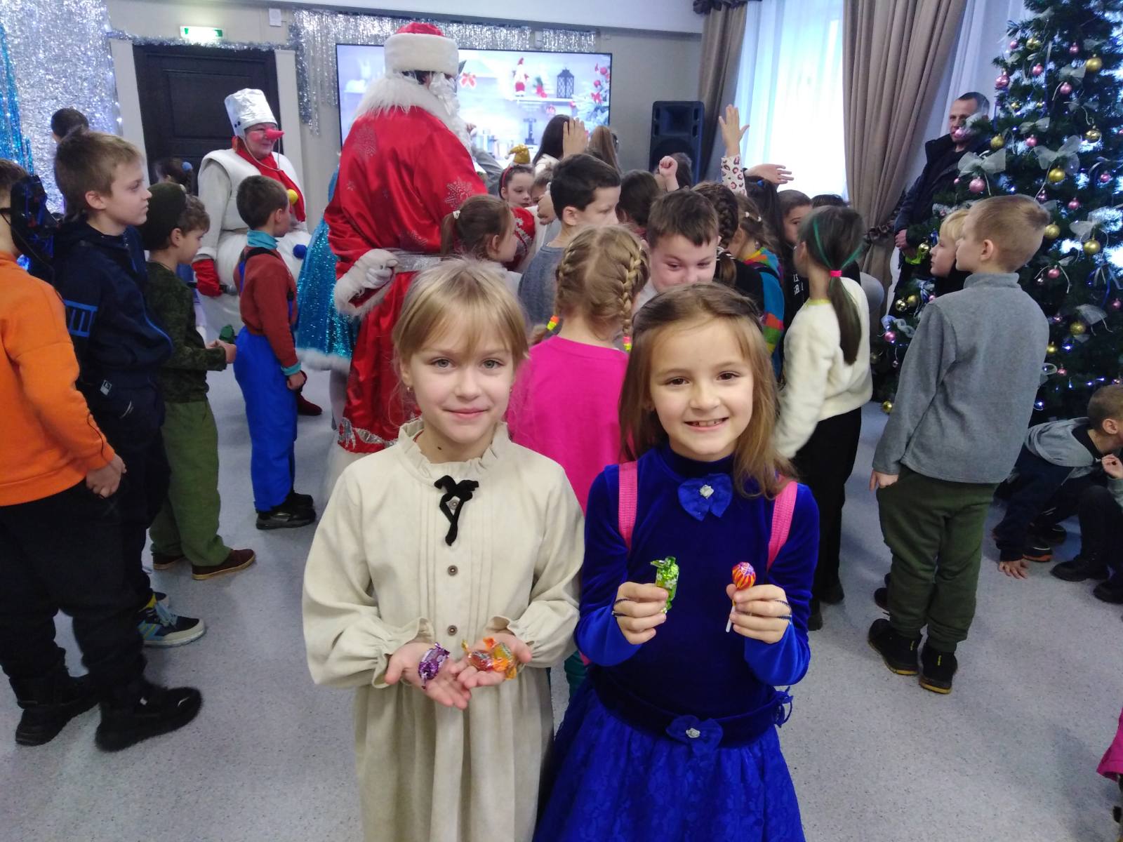 А какой же праздник без главных героев торжества? Собравшиеся ребята с улыбками и ожиданием чуда встретили Деда Мороза и Снегурочку, которые подарили ребятам хорошее настроение.