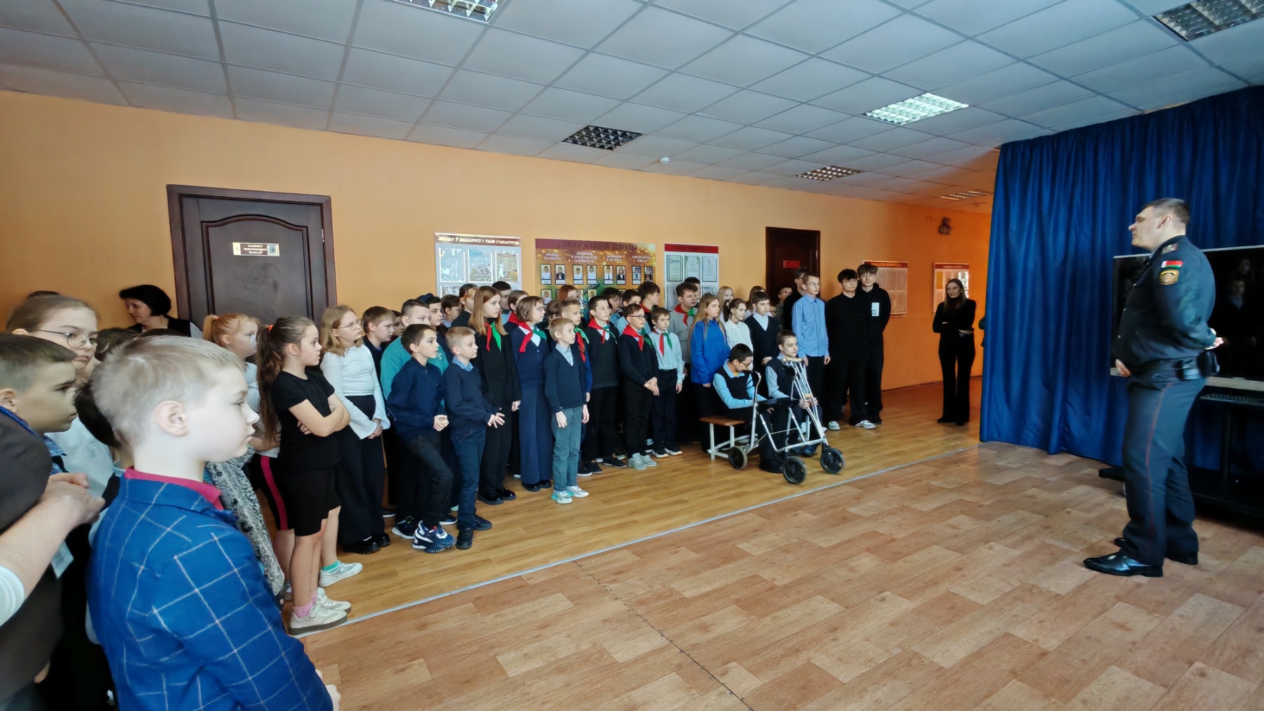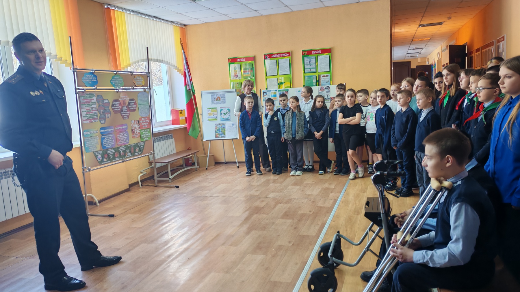 03.02.2026 в ГУО «Выверская базовая школа Молодечненского района» в рамках межведомственной акции «Дружим с Законом» состоялась беседа инспектора по делам несовершеннолетних Танюкевича Александра Викторовича с учащимися школы по вопросам недопустимости участия несовершеннолетних в несанкционированных массовых мероприятиях, предупреждение деятельности неформальных молодежных групп антиобщественной направленности, предупреждение преступлений в сфере высоких технологий, незаконного оборота, предотвращение буллинга. Учащимся напомнили о правовых последствиях за совершение деяний до достижения возраста, с которого наступает уголовная и административная ответственность.