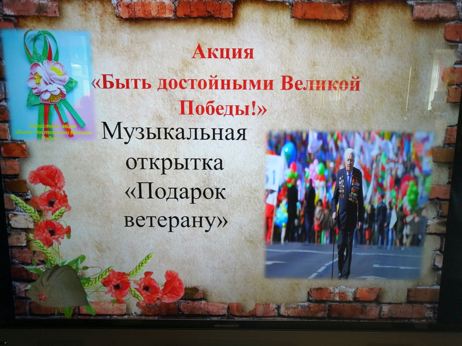 05 05.2021 в учреждении продолжили проходить мероприятия в рамках акции «Быть достойными Великой Победы!». Учащиеся учреждения подготовили музыкальные открытки «Подарок ветерану».