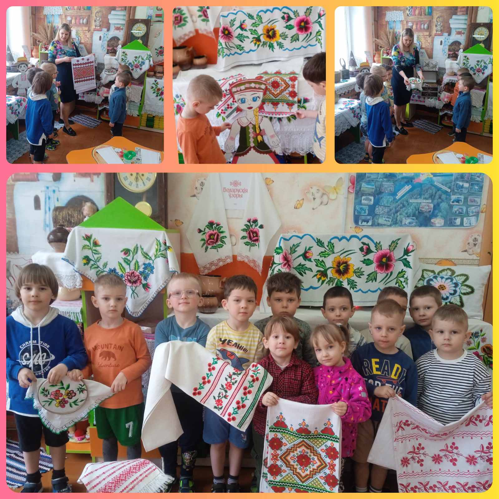 В первый день педагогического марафона в нашем учреждении прошло увлекательное занятие по рисованию «Путешествие в старину. Декорируем рушник», направленное на приобщение воспитанников к национальным культурным традициям. Мероприятие получилось по-настоящему семейным и познавательным. Совместно с родителями была организована выставка декоративно - прикладного искусства. В экспозиции были представлены уникальные предметы быта: старинная глиняная посуда, а также изделия, украшенные вышивкой — простыни, скатерти, наволочки и, конечно, рушники. Дети с интересом рассматривали узоры, созданные руками мастериц много лет назад. Во время занятия ребята познакомились с историей белорусского рушника. Особое внимание уделили видам орнаментов: геометрическому (ромбы, квадраты, линии, символизирующие землю и солнце) и природному (стилизованные цветы, листья, деревья и птицы). Вдохновившись увиденным на выставке, воспитанники выступили в роли народных умельцев. Под руководством воспитателя они декорировали свои рушники, используя природные элементы орнамента. Каждый узор получился неповторимым. Такие занятия помогают сохранить связь поколений и прививают детям уважение к истории своего народа.